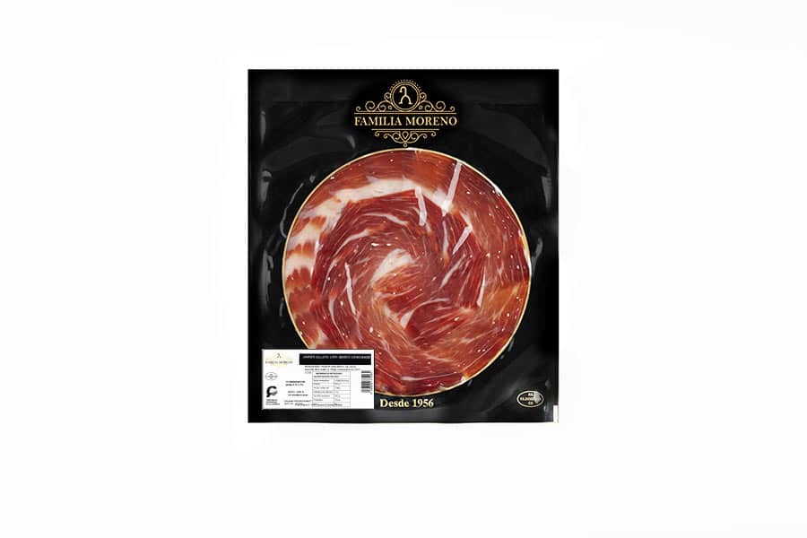 Jamón de Bellota de cerdo 100% iberico loncheado a mano y envasado al vacio. Sobre de 100 gr. Envasado al vacio