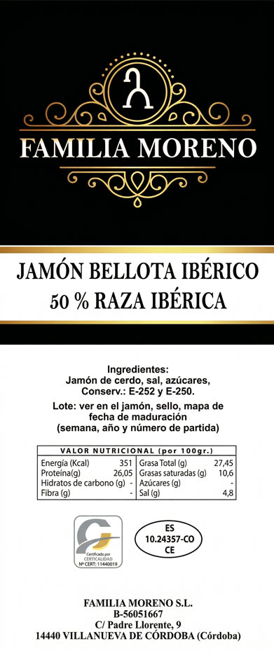 Los jamones de Familia Moreno S.L. proceden de cerdos de bellota 50% ibéricos y seleccionados de entre las mejores estirpes y “engordados” en la mayor dehesa del sur peninsular, en la comarca